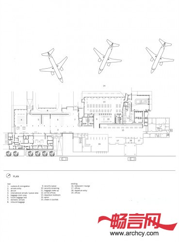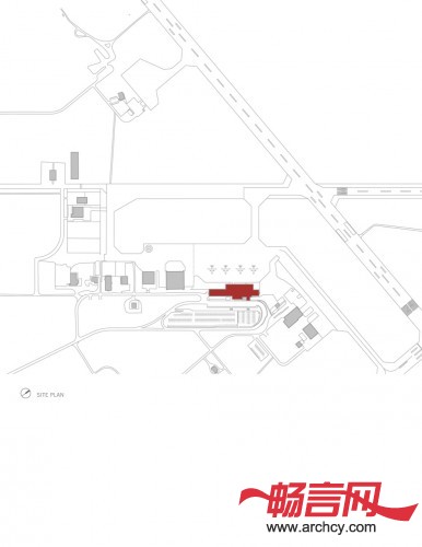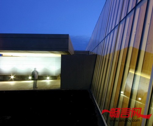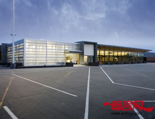 在铝制框架上安装上半透明的聚碳酸酯木板,围成的这个区域,就是机场的行李化妆区,它位于大楼的建筑背面。聚碳酸酯屏幕能为里面的办公区提供隐私,同时,让乘客从飞机上走向地面时,他们就能看到这个漂亮的“透光盒子”。深灰色的纤维水泥板和雪松木版是该区域的室内外主色调。