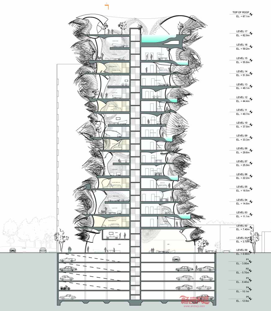 “活跃孔径”项目独特之处在于其试图重新思考窗户的本质,包括窗户功能、组件、外观、材料以及针对20层住宅楼类型建筑的应用。孔径作为依据空间,起到室内外界限的功能,回应太阳、风等外界作用,挖掘自然与建筑环境间的能量交换潜能。室内区域造就了建筑外观,建筑具有的模糊边界始终保持流动感,而并非传统建筑给人的僵硬尖锐感受。