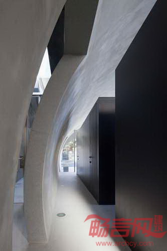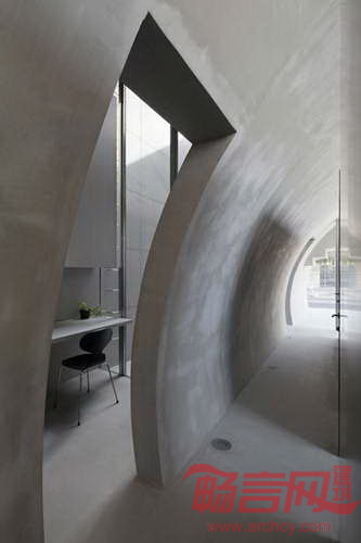 日本塚田真树子建筑事务所设计了位于东京的“隧道”住宅——住宅的基底被混凝土隧道穿越,形成外立面上的圆洞,露出下方的楼梯。项目面向丁字路口,设计师创造了一种相当于道路延续的结构。设计结果是一个截断整个一层区域的曲面容器。设计师表示,“设计意图是提供街道的视觉延伸,创造一种交叉结构。”房屋其它部分围绕隧道而设,营造一系列非同寻常特点,包括漂浮的钢板楼面、楼梯下方的餐桌、三倍高院落以及没有天花板的卧室。
