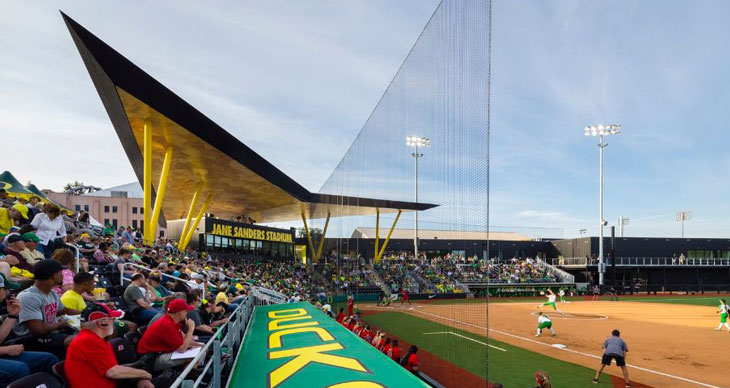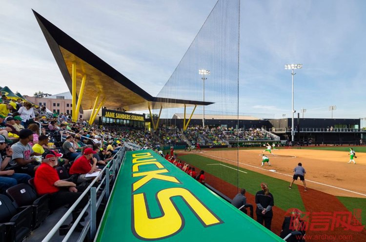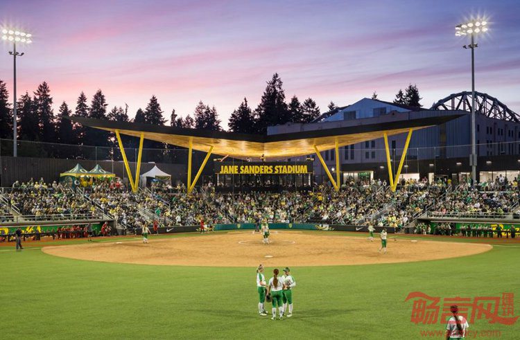 SRG工作室设计了美国Eugene俄勒冈大学Jane Sanders体育场。项目面积19100平方英尺,于2016年完工。这是一个流畅的体育场,是俄勒冈垒球鸭队的主场,体现了力量和能力。场地容纳1500个固定座位,出资人是Robert Sanders,根据其已故妻子Jane命名,设计优雅的融入俄勒冈大学校园肌理。运动场座位区上方标志性高耸的顶棚,契合了垒球队创新的代表精神。