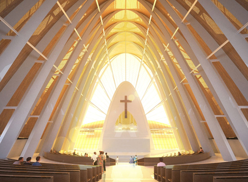 DOS设计所旨在将该教堂成为莱基城的标志性建筑。此设计在众多竞争者中脱颖而出。这个美观的功能性的设计可以使2000名会众享受良好的自然光的,通风的内部环境,很好的音响效果和没有阻碍物的,一览无余的祭坛。另外,此建筑还有一个30人的妈妈看护区,在该集中区中有一个透光的玻璃隔断,可以使家长们在祷告的同时也能直接看到他们的孩子。