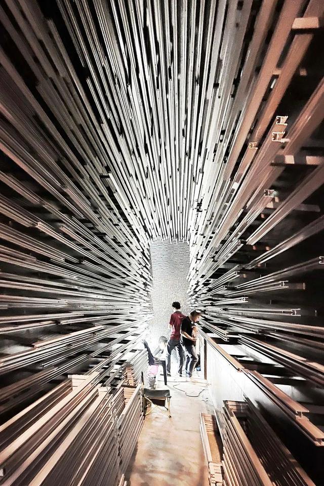 MoMA的设计特点不仅将铝条作为展示品,更延续建築、室内、景观、照明与家具,塑造内外一体性的感受。其立面由数万根铝条包覆,每根铝条的颜色与纹路都略有差异,如同蒲公英般每根羽毛都不同;而长短不一的铝条结合LED照明,从正立面延伸至两边侧立面,再笔直贯穿西侧“孔洞”空间,过滤并纾缓外部环境的喧嚣浮躁,引导参访者至一处静谧的展览场所。