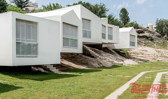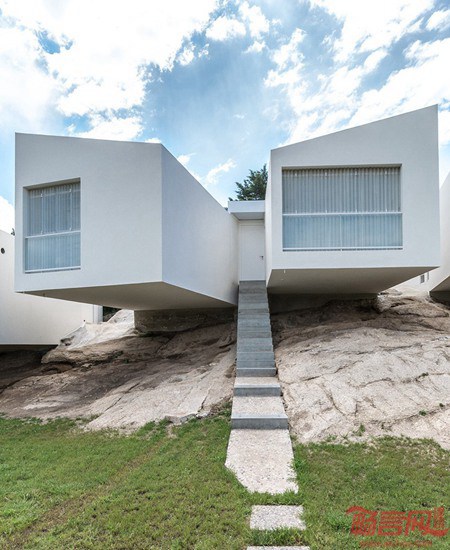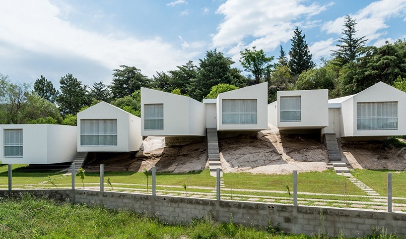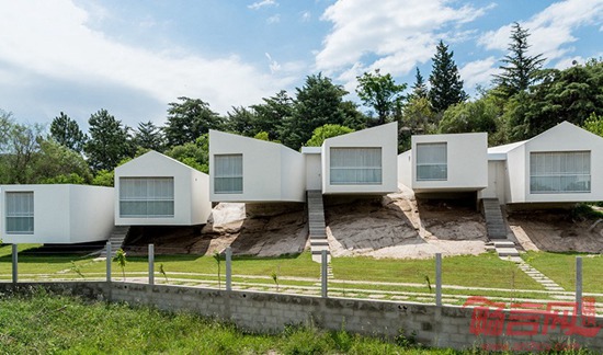 建筑师Carlos Alejandro Ciravegna完成了位于阿根廷多山的Cordoba地区的五座模块化住宅。项目坐落于Villa Carlos Paz市,这一系列房屋以平衡姿态矗立在岩石上方,随着不规则地形略微起伏。建筑设计同所在区域相互融合,室内布置满足了不同的功能需求。优越的地形和场地使住户可望见San Roque湖和San Juan。住户通过位于悬吊结构中间的楼梯进入室内,陆续可来到起居室、厨房和浴室。