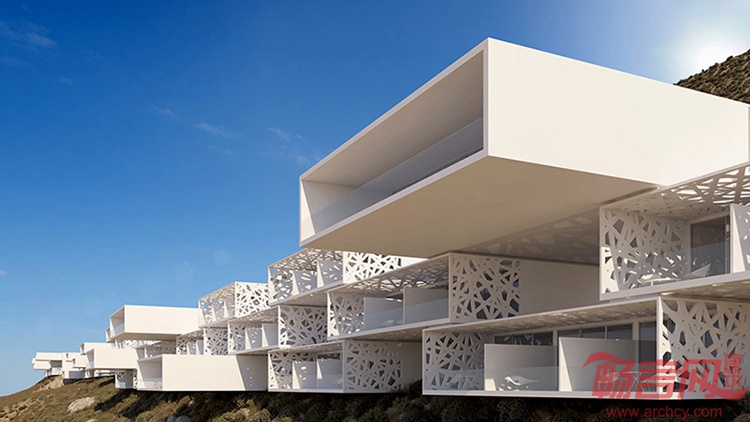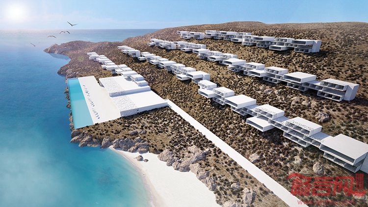 Mykonos白色盒子度假酒店坐落于美丽的地中海海岸,项目由雅典Potiropoulos+事务所设计。项目同自然景观的对话以及当地传统居住记忆构成了整体的设计理念。白色立方体构造的酒店以半圆阶梯型分布在山坡上。房间和套间营造出的线性序列令人联想起更大规模的清水石墙。这一设计最大程度凸显了自然光照的优点。