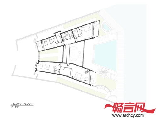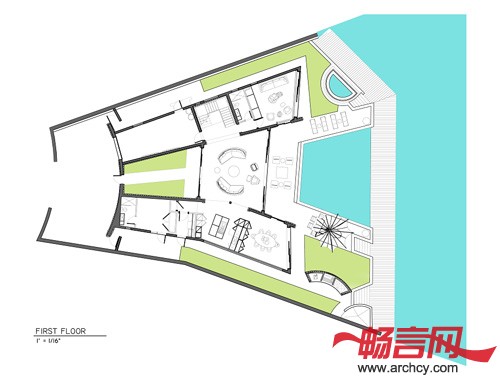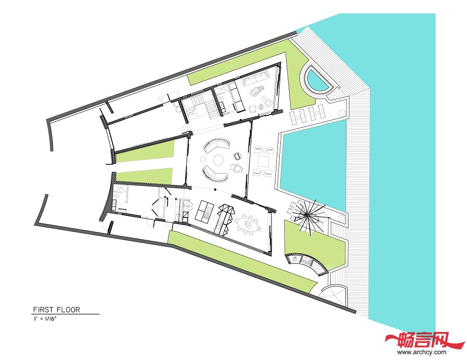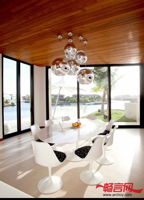 功能分区:3间带有浴室的卧室、一间带有能从房子外面直接进入浴室的卧室、一个书房/电视房(这里也带有浴室,为以后转化成卧室做铺垫)、起居室、餐厅、厨房、车库、游泳池、桑拿房、小船和水摩托停靠台。