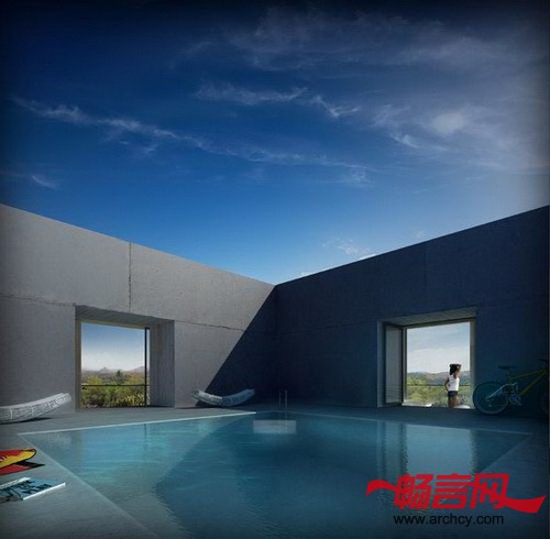 住宅中的门廊作为一个房间显得过于狭窄,作为一个露台又有些深。在空气流通良好的平台中间设有一间单独的内部空间。这个空间没有房顶,并且它的四个方向没有任何阻碍,可以使使用者观赏四面八方的景色。它的中间设有一个尽可能深游泳池,同时将这栋住宅与地面分离。在这个天井泳池里,你可以经历飞天入地的奇妙旅程。