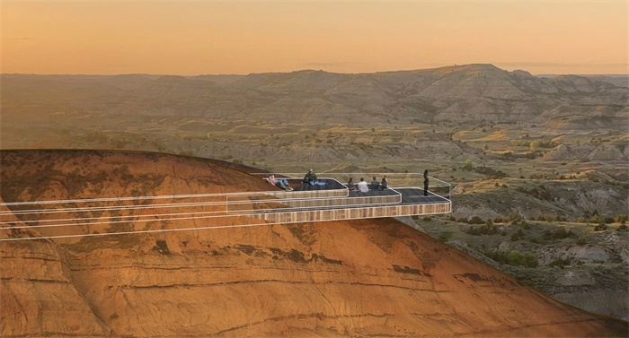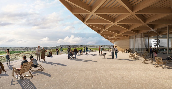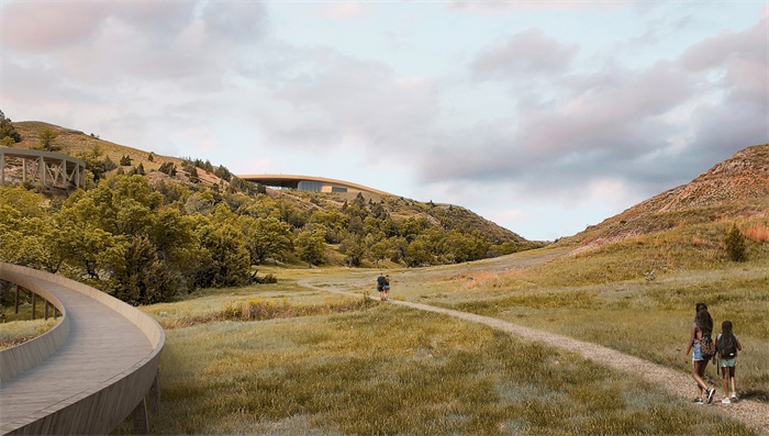 Snohetta中标设计设有巨大的弧形屋顶,基地周围是荒地,毗邻西奥多·罗斯福国家公园,可以看到麋鹿牧场。建筑为Butte东北边缘设计,连接到一条弯曲通道,引导游客参观现场,并连接Maah Daah Hey小径和其他展馆。