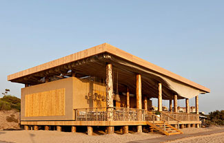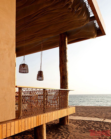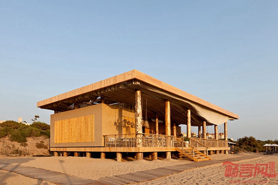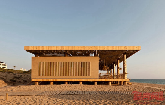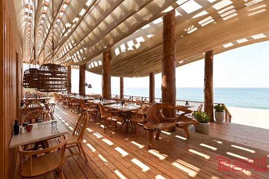 K-Studio公司设计了位于希腊Costa Navarino海滩的度假餐厅。设计师利用木材料多样功能,组台了若干设计元素,营造出一个能给人带来灵感的悠闲空间,整个建筑都完美地融入在周围的海滩风景中。若干根天然的木制圆柱形成的栅格构成了建筑的整体结构;在这些栅格结构中,穿插着一个“L”形的实体空间,它如同沙堡一般,屹立在森林般的树干中。