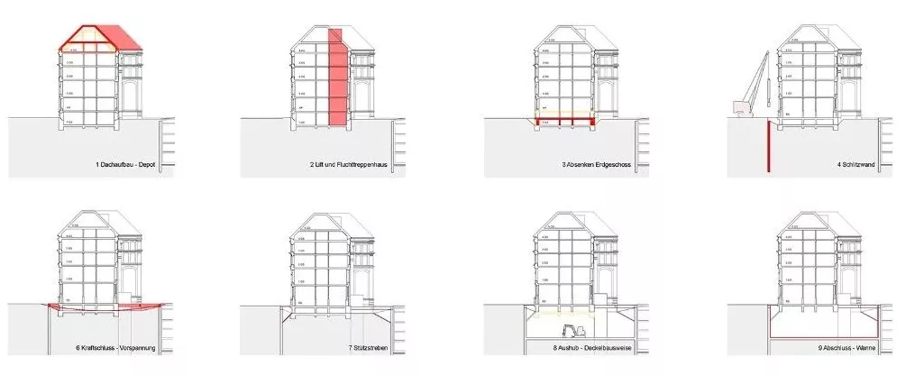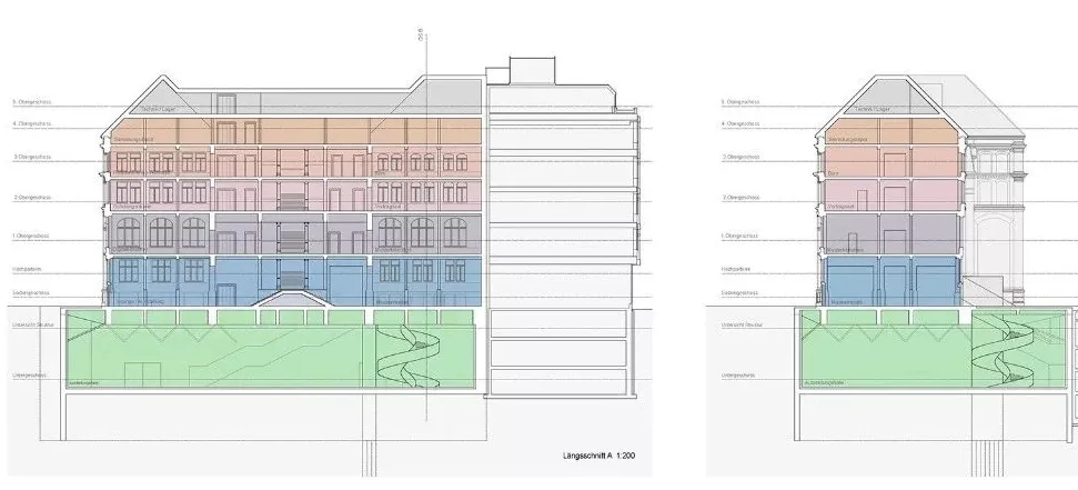 瑞士圣加仑纺织博物馆(Erneuerung Textilmuseum St. Gallen)建于1886年,博物馆到今天已经有了近 140 年的历史,因此该场所在安全性和便利性上已经满足不了游客的使用需求,此外藏品所在的储藏室分布在整个建筑中,不利于藏品的管理和维护,展馆的安保和维护方面的技术也不是最新的。因此,博物馆建筑不仅需要彻底的翻新,还需要进行部分的重新设计,以使建筑在未来更加开放。Christian Kerez 放弃了给原有建筑做加法的方式,而是将屋顶景观从后来的建筑中解放出来,将这座历史建筑恢复到其旧轮廓,并为屋顶下的仓库创造了空间。