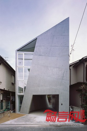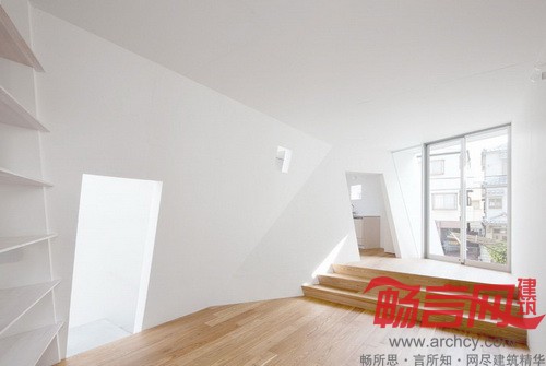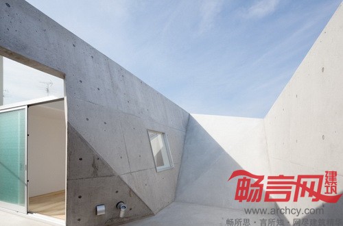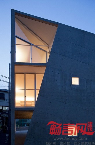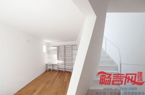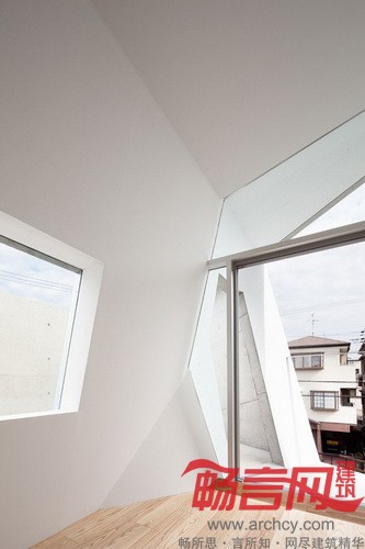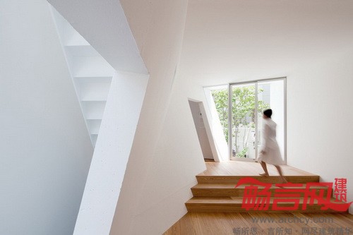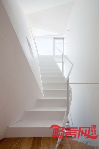 房子正面的东部有一条“裂缝”从1楼一直延伸到3楼,这样就形成了很好的室内采光条件,使曲折的墙壁在光线的反射中显得格外漂亮。当自然光线充满曲折的室内空间时,会给人带了一种仿佛置身室外的感觉。