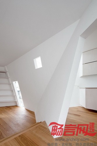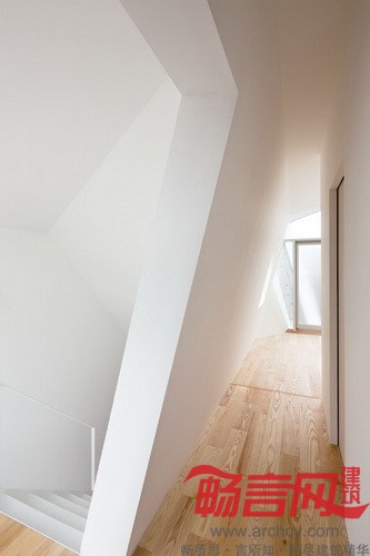房子的整体外形被“挤压”成一个平行四边形,这样就能与周围的建筑拉开一定的距离。房子中央的一面墙壁斜跨整个地基,将1楼空间按对角线划分为2个区域,这面墙折叠向上延伸,到了3楼又与地面形成了平行关系。各层楼板似乎是跳跃向上的,而且屋顶也是倾斜的。人们可以顺着曲折的墙壁来到房子里的各个角落,感受多样化的空间结构。