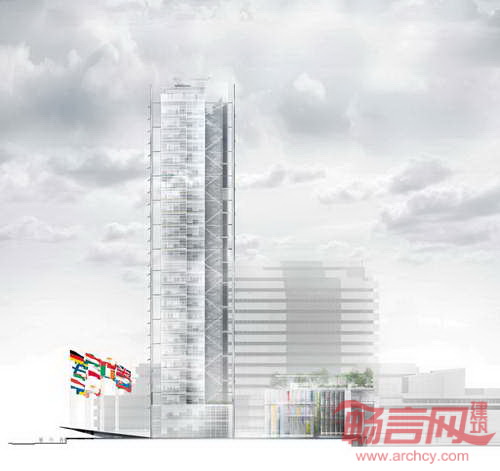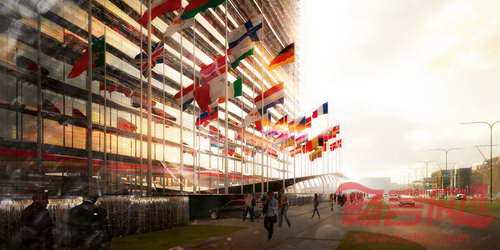 由法国建筑师Jean Nouvel设计的欧洲专利局(EPO)办公大厦将破土动工。项目位于荷兰海牙,占地8万平米,为业主1750名员工提供了灵活舒适的办公环境。建筑高达100米,成为EPO倡导的欧洲创新理念的鲜明象征。这座几乎全透明的建筑如同漂浮在场地上,玻璃和钢外立面透出沉静安宁的质感,自然地融入了城市天际线。建筑周边是水面环境,不锈钢材料的入口处两侧设立了45个欧洲国家国旗。通过低于水平面的入口处,游客继而进入6米高、充满自然光照的大厅。接待处设置了一系列潜望镜,反射周边景致。办公区采用开放式设计,鼓励员工间的交流沟通、相互合作。预计该项目将于2017年4月竣工,景观设计将于2019年年初完成。