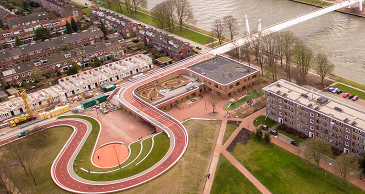 NEXT事务所设计了位于荷兰乌得勒支的110米步行桥。这一多用途的桥梁跨越了阿姆斯特丹莱茵运河,将于下个月投入使用。独特的结构结合了行人桥和自行人桥的功能,并同学校和公园空间相结合,构成连贯统一的设计。桥梁距水面9米悬挑,最高点距水面35米。