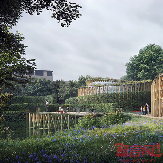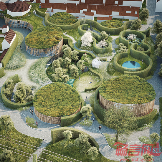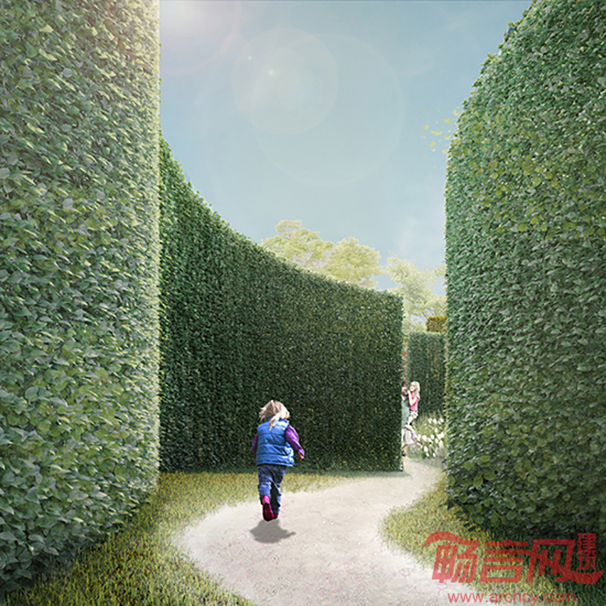 项目占地9000平方米,包括一个儿童文化中心,宛若置身于“魔法花园”之中。项目整体绿色盎然,中间有许多弧形的场馆,四周环绕着螺旋状的绿篱笆,仿佛迷宫一样。场馆建筑面积为5600平方米,其中有2/3的楼面在地下,营造一个下沉的童话空间。