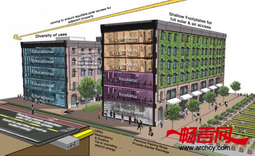 我们的能源策略将提供区内所需能源量四倍的能源。在我们的工程里,我们将使用多种设备,包括屋顶和路旁的光伏系统、使用有机肥料生成的沼气、以及在单个住宅楼中的热电连供系统等等。