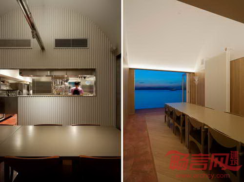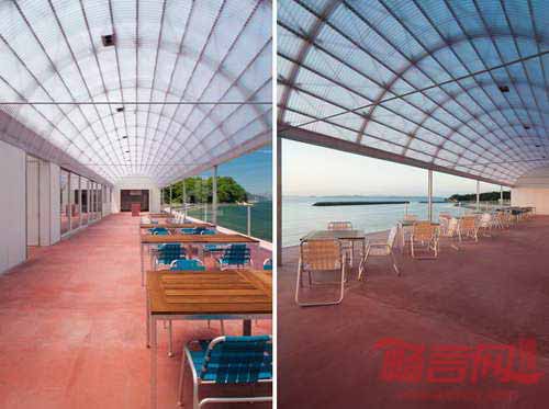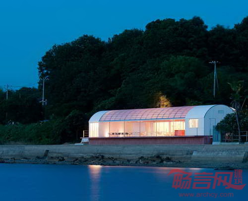 海上餐厅位于日本丰岛,由CASE REAL建筑事务所设计,为2013年濑户内国际艺术节的当地居民和游客提供了就餐场所。食品是岛上的一大问题,这里有大片的稻田遭到了荒废。设计主旨是创造包容的美食空间,为尽量广的人群提供可口的食物,复活当地的经济。餐厅建筑由两个延长的弧形结构组成,一个大露台为客人提供欣赏优美海景的空间。露台空间是设计的核心,成为连接主厨房、公共厨房和座位区的枢纽。半透明聚碳酸酯板材围护其空间,提供了充足的自然采光,与室内环境形成了截然不同的氛围。