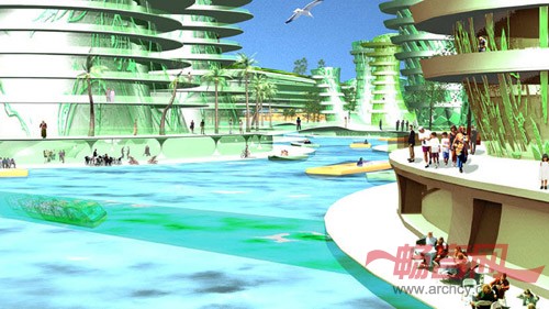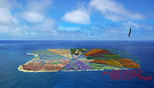 荷兰的WHIM建筑所计划在北太平洋环流这片环境恶劣的海上建立一个可容纳50万人的可持续发展的,完全自给自足的浮岛。这个岛同夏威夷一样大小,可以处理海上的44000吨塑料垃圾。