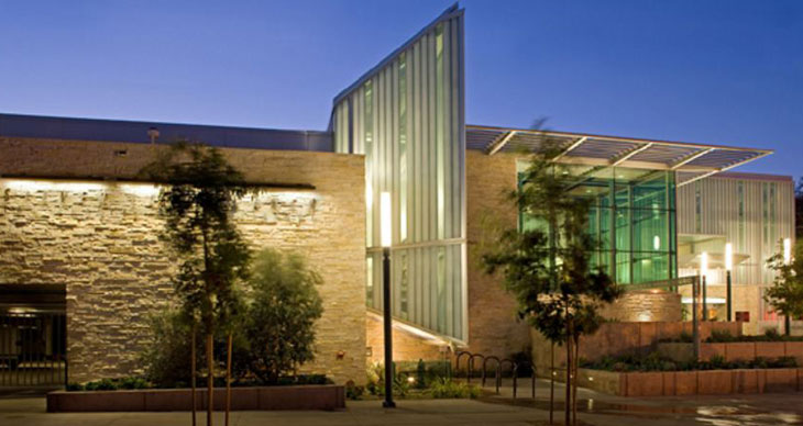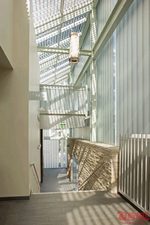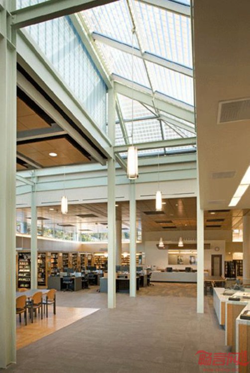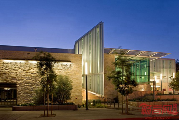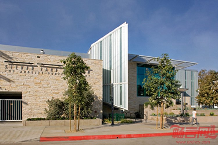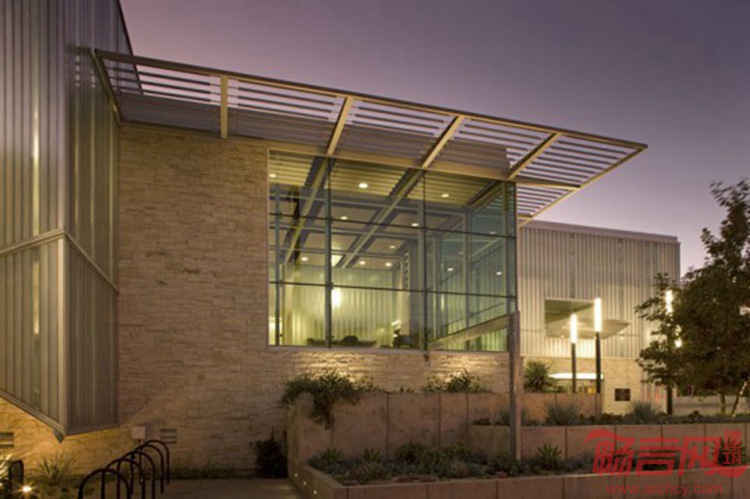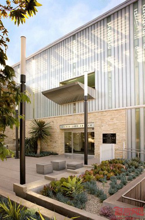 作为社区的门户,洛杉矶公共图书馆银湖分馆选址位于一个繁忙的道路交口,其玻璃外形划出一个公共广场,向更大范围的社区居民敞开怀抱,为建筑自有的基础文学和社会聚集功能,营造出亲切友好的背景。广场地势比附近街道较高,带有知识至上的传统理念,为社区提供此前并不存在的聚会场地。全玻璃落地窗的阅览室和玻璃花园使室内外的界限不复存在,将这一起居室空间向广场敞开。中轴线为建筑中央区域带来自然光线,其光伏天窗帮助建筑赢得LEED金质认证。建筑其他位置的天窗不仅引入自然光,也为使用者带来附近山景和天空景致。错层设计包含地下车库,并使多功能室更好服务于街道、图书集市以及其他社区活动。