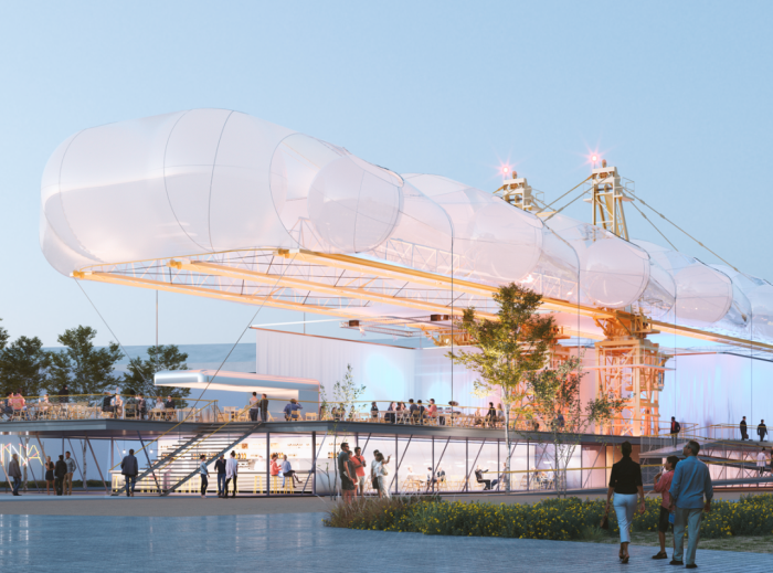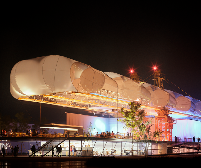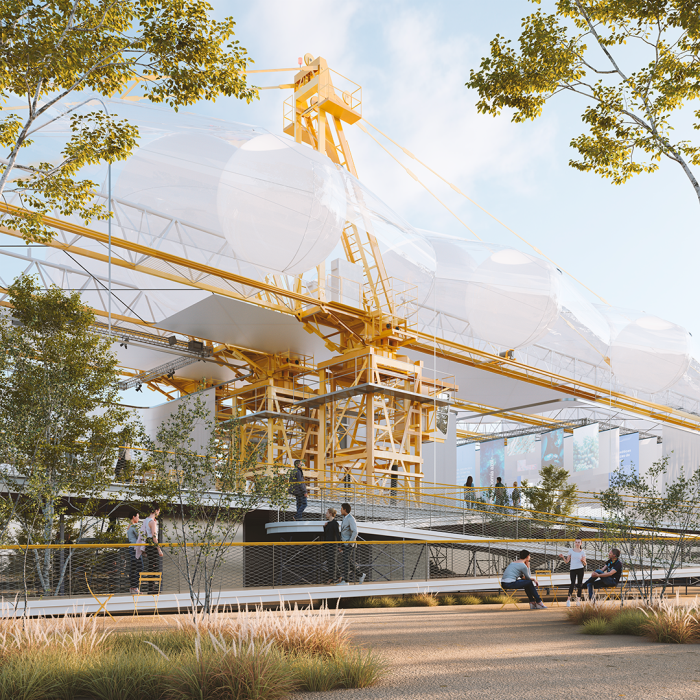 项目首先会租用一台塔吊进行组装工作,组装结束后它将留在现场,并且随后被固定在指定位置。当基底部分被全部组装好后,另外两台租来的塔吊也将加入进来。项目将在世博会期间持续租用这三架塔吊,并在世博会结束时将其归还。它们将以6米的间距平行着固定在一起,并将作为建筑的主要结构,支撑其上轻质的纺织品顶棚。除此之外,三个像梳子一样的塔吊下方,将布置设备走线和舞台聚光灯。
