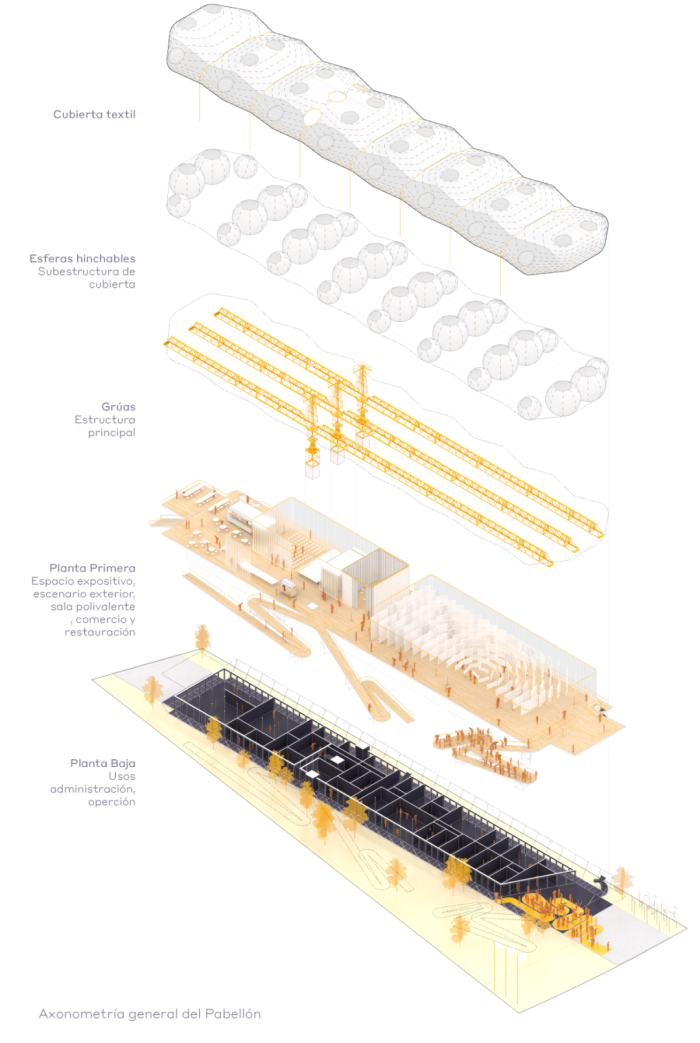 基于该策略,建造的第一步将是创建一个预制的模块化底座,并使其尺寸适合用集装箱运输。所有模块将通过船舶运到大阪港口梦洲岛(Yumeshima Island)的集装箱码头。世博会期间西班牙馆展览和演出所需的所有必要设备和材料,都将被整合进这些集装箱大小的模块内。当组装完成时,这30个模块构成的空间也将容纳建筑内部所有被围合起来的区域,即:入口、办公室、贵宾室、操作区、厨房、仓库、更衣室、厕所、餐厅和小吃店,这些区域的面积加起来是1070平方米。