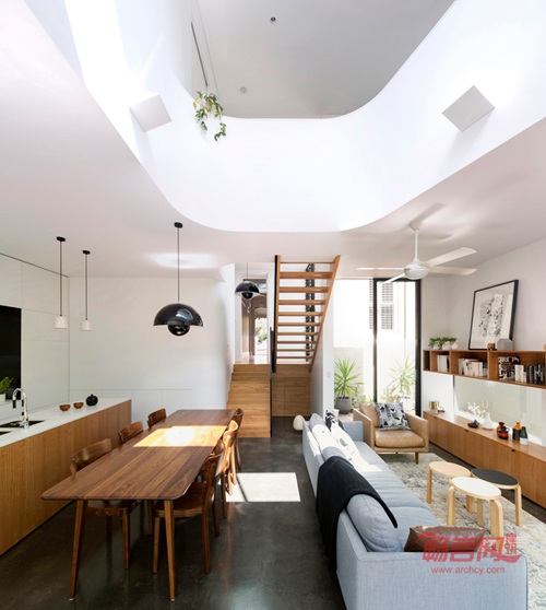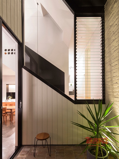 这个错层空间依据周围环境和现有住宅而设计,是一个融合了本土和现代元素的连接空间,起到了室内贯通和通风的作用,而且中间还有一个小庭院。