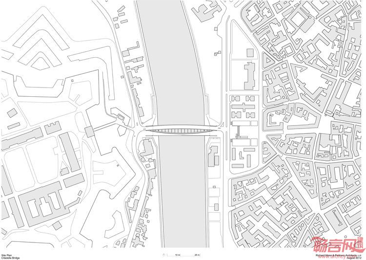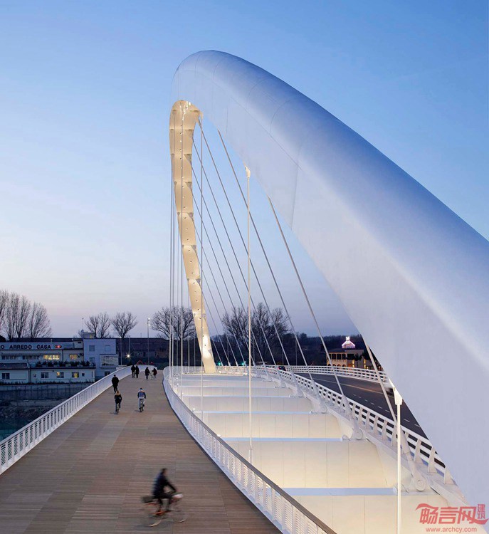 Cittadella大桥长185米,位于意大利Alessandria,替代了拿破仑时期的旧桥,后者在94年洪水中被冲毁。新建大桥跨越了整条河流,由Richard Meier事务所设计,和Gobetti广场一道,城市期望激起对于城市保护的重视。设计师表示,在接受了委托的20年后,我很高兴这一链接新旧城区的桥梁最终建成,将城市的过去和外来贯通。新建大桥不仅仅是一个枢纽;还是一个公共空间。由于旧桥交通常常阻塞,对于行人几乎没吸引力。因此,新建筑将步行道和车行道分隔开。两侧由高高的钢铁拱廊分开。拥有这座壮观的大桥,城市希望能赢得更多的国际关注度,并实现复兴。