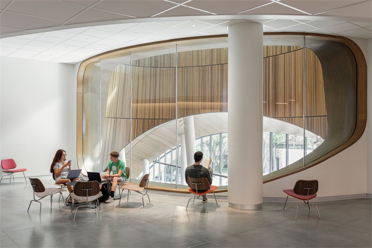 Snohetta(斯诺赫塔)建筑事务所刚刚完成美国费城天普大学图书馆建筑设计。弧形的木质凹陷入口构成了项目一大亮点。四层图书馆位于城北,在校园的中央,商学院设在南侧,科学工程楼在东侧。平面方案为矩形布局,图书馆建筑面积为2万平米,设有大理石裂面基座和玻璃顶部。