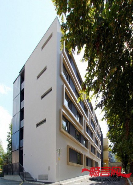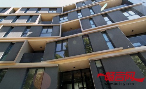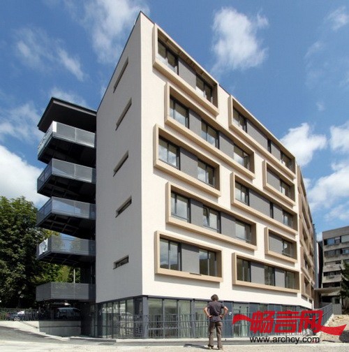 建筑师把公寓楼设计成一个明亮的、现代的、又有点传统住宅特色的建筑。它的基本样式是:清晰的空间分隔、平屋顶、前面是整面的幕墙,幕墙上有壁橱式的窗户,南北两面幕墙上有内嵌式木质方形空间。这些方形空间代表的是独户小型住宅,它们是对公寓楼住户的旧时“小型住宅”的再现和全新诠释,那时候,人们的房子都在同一个屋檐下。无论是室内还是室外,建筑师都主要使用天然材料来装饰,这样让公寓看起来更有家的感觉。