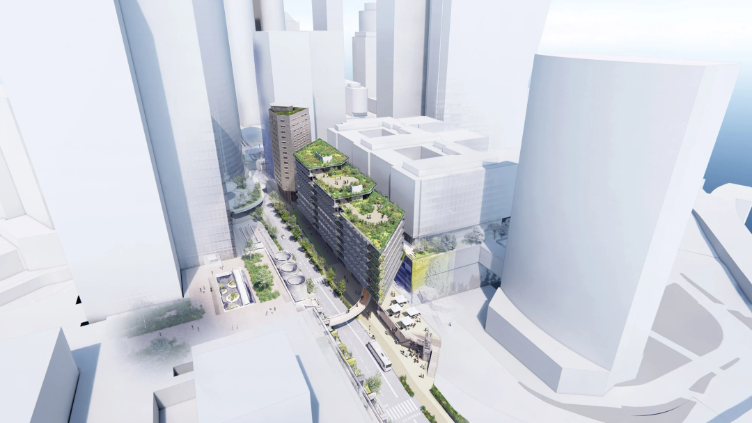 另一栋低层建筑包括6至8层的灵活办公空间、阶梯式的屋顶绿化、250平方米的临街展馆以及设有美食广场、室内市场和屋顶露台的1400平方米的综合空间。