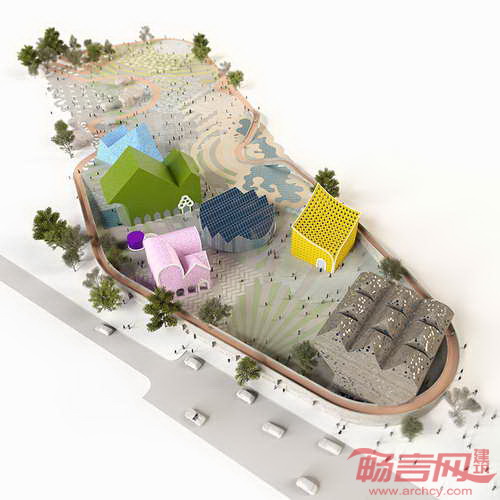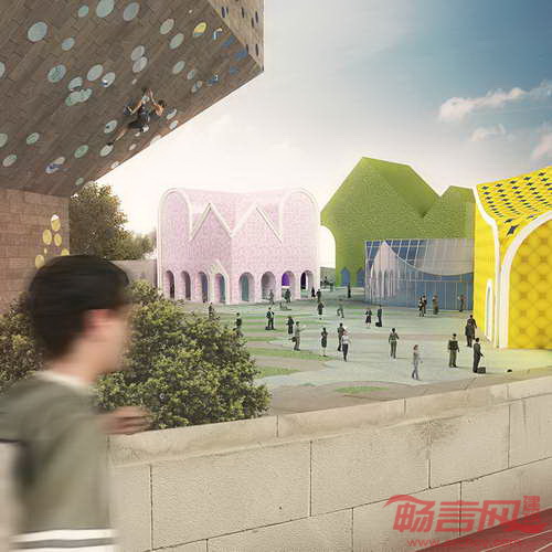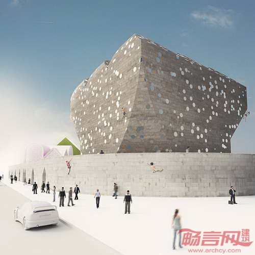 建筑设计中运用了丰富质感表皮和鲜艳装饰色块。活动中心设有多个采用鲜明材料和形状的区域,吸引游客攀岩、休憩或即兴舞蹈。