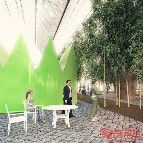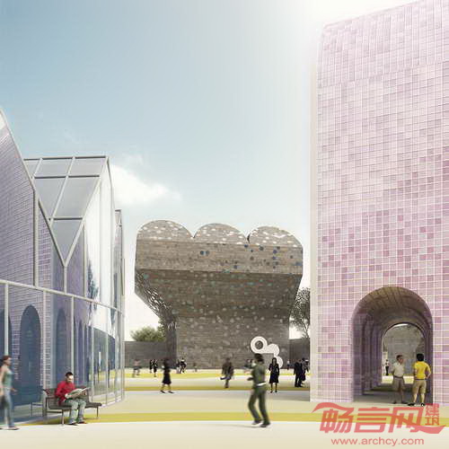 项目采用当地方言建筑形式,使建筑抽象性融合进当地常见建筑形式之中。项目场地中央,高耸的建筑屋顶如同高山般雄伟,同时外形表现出有趣诙谐性。