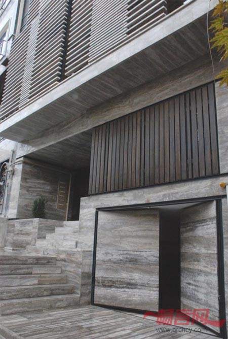 该项目的正门显示了物质相互作用的重要性。由于使用了天然黑色木材,灰色的大理石显得柔和了。