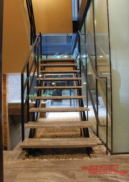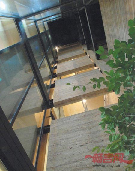 建筑内部采用了和外部一样的材料并置的设计理念,以大理石和木材为主。