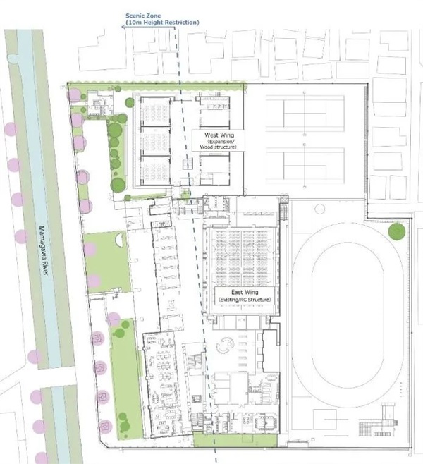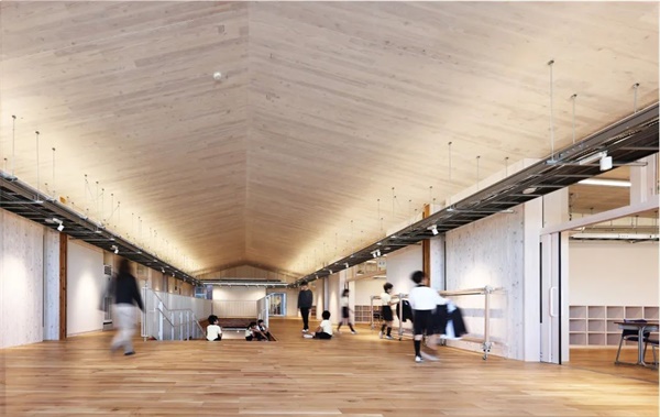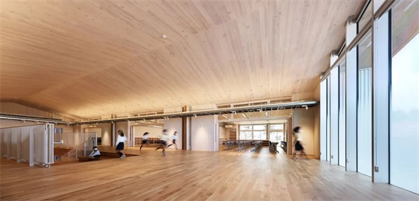 项目用地位于真间川沿岸由水体和绿植构成的城市中心区域,河岸上长达2公里的樱花步道为城市增添了一抹色彩。由于城市规划对高度和景观等有着严格的限制,同时还需对连接原有校舍的水平高度进行调整,因而采用了没有梁的“CLT双向无梁板结构”,在确保与原有校舍具有相同吊顶高度的同时最大限度地降低层高和建筑高度。此外,通过使用CLT减轻上部结构的重量,减少地基的负荷,从而缩短工期。