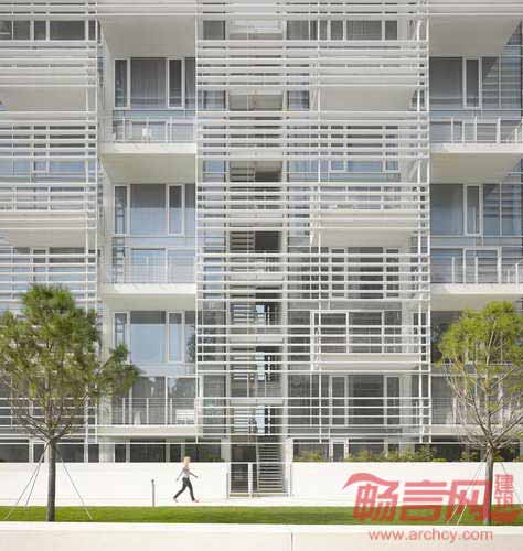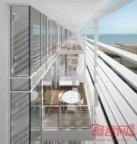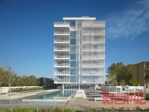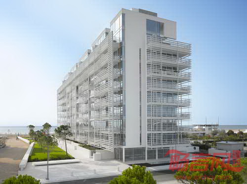 Jesolo Lido公寓楼是Richard Merier事务所在意大利的第五个完工项目,使此前竣工的Jesolo Lido居住村向亚得里亚海极大地延伸。场地周边环境由不同密度的建筑群组成,包括海景别墅以及豪华高层住宅。空旷的入口广场使别墅和高层建筑住户同时拥有海洋视野。尽管项目被道路分隔,建筑采用的白色色调和遮阳板产品使其外形得到了统一。