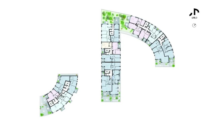 设计从地质构造中汲取灵感,两座立面弯曲的建筑一大一小,从河面向屋顶倾斜,以获取更好的城市视野。这些逐渐后退的梯田布置着充满绿色植物的花盆,将河岸葱郁的绿色景观向上延伸,直到建筑顶层。在两个建筑间的一个种有果树的花园,也强化了这一绿色氛围。