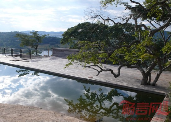 三层混凝土板之间玻璃盒子构成了一个双层高的居住空间,上层包括一个开放式的休息室和餐厅,还有一间以下方水池为界的主卧室。