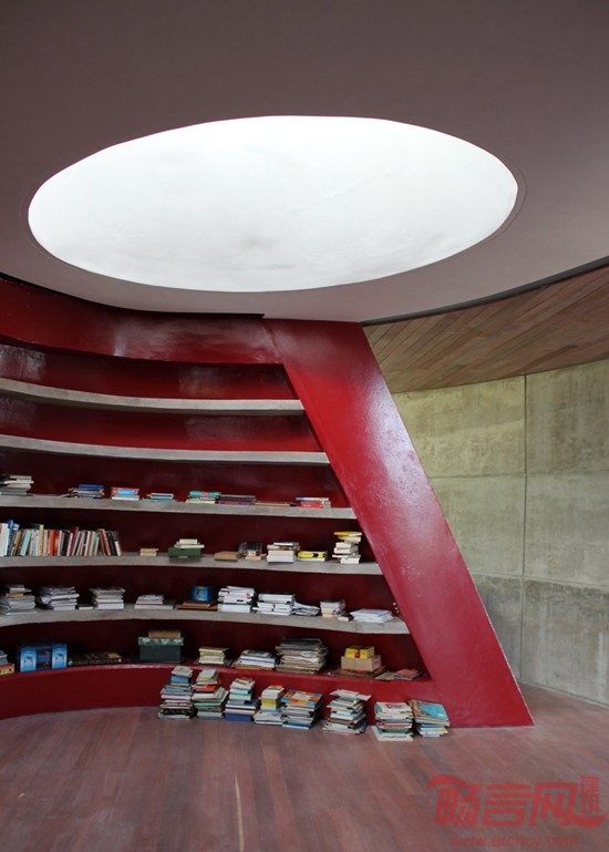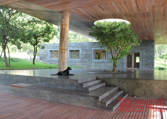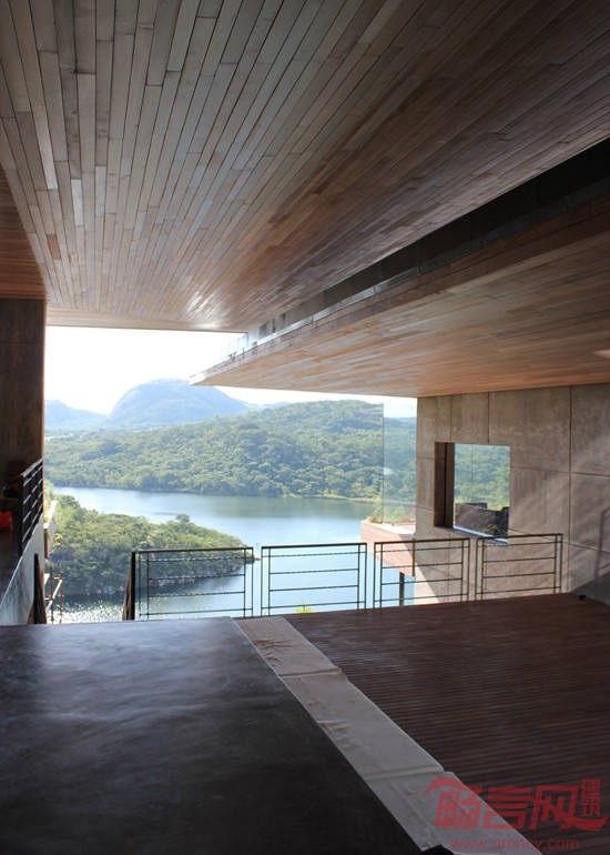 房子建筑面积为1500平方米,房子夹在三层混凝土板之间,混凝土板由模板包覆,房子整体就像一个三明治一样。凸出的屋顶还能为主会客空间遮挡强日光照射。
