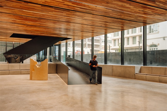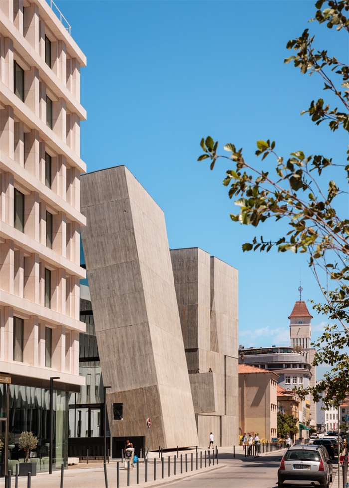 这个人工坡地还解决了地块的另一个问题:由于项目位于里斯本城市网格的第二排,朝向河流的视觉连续性更多停留在理论层面,而非现实层面。街对面的EDP总部大楼,虽然在总体体量上满足了南北方向的连续性,但在行人视角上却阻挡了人对河流的感知。因此,我们在坡地上架起一块混凝土结构,向河流方向悬挑延伸,其高度足以越过相邻建筑,人们便能获得眺望塔霍河的清晰视野。