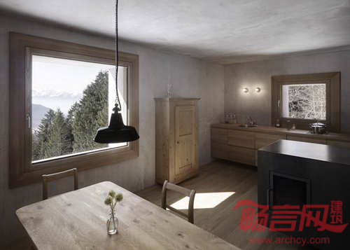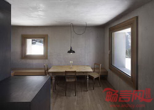 室内区域的墙面和天花板是光滑混凝土材质,与粗粝的立面形成对照。地板、门窗均采用橡木,家具也采用同样材质。方形窗户装点了立面,成为简洁立面上唯一的介入物。
