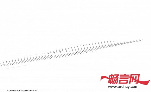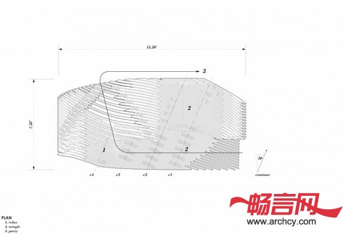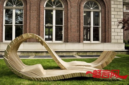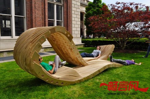 小亭的形状由一组连续的板条构成,它并尽可能地减少与地面的接触。根据功能的不同,板条的密度是根据三个不同用途设计的:板条密度最大的地方用于行走和坐卧;板条密度居中的地方被设计成靠背;板条最稀疏的地方则用于遮阳。这个凉亭大约15.5英尺长,7.58英尺宽,6.83英尺高,是一个人们休息和放松的宜人小建筑。