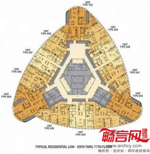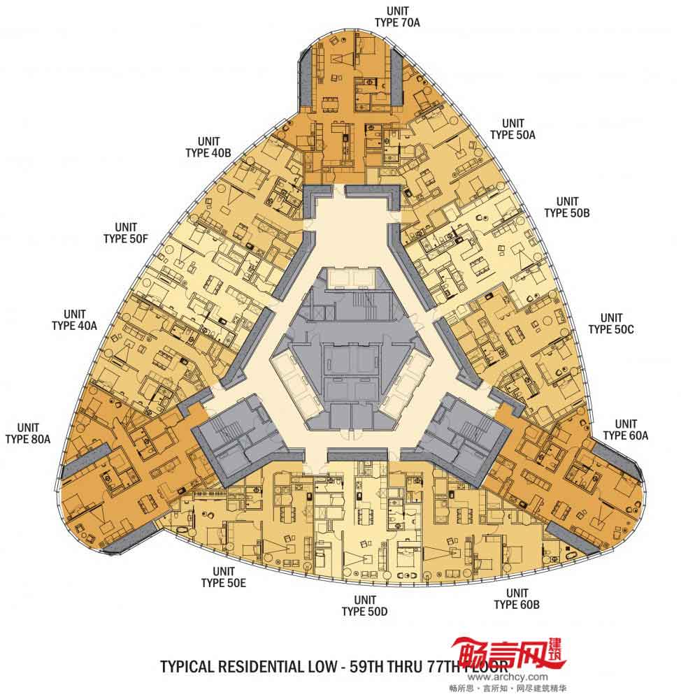 住宅位于大楼59到77层,包含12个两室或三室的套间,而83到98层包含9个套间。大楼的办公区域将采用开放式楼层方案,以方便租户改造。从顶层的观景平台,不受阻碍的城市视野将尽收眼底。