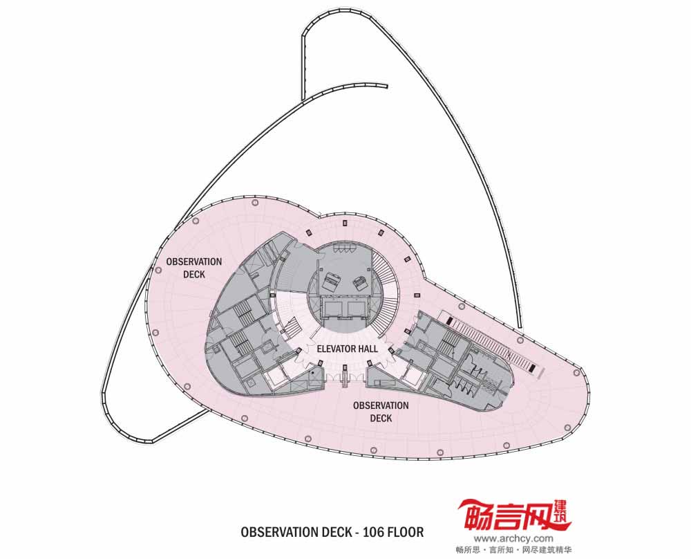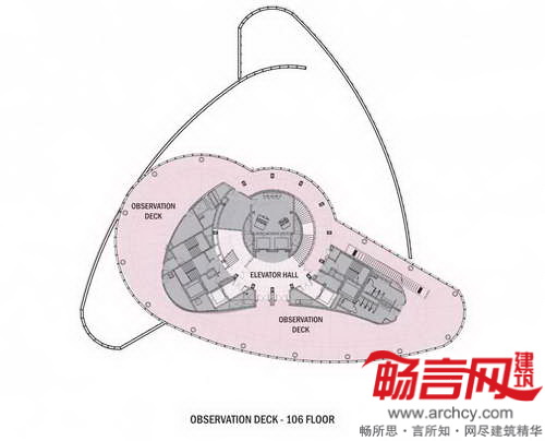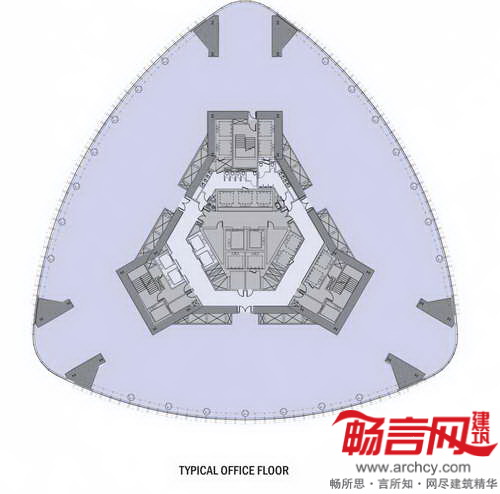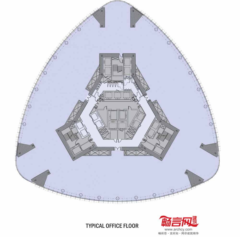 混凝土悬臂梁墙将平面四周的立柱载荷传导至6个巨型柱,从而使每个层台拥有独立的适宜其功能的柱网布局。