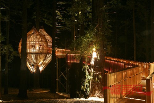 该项目位于森林的边缘,建造在最高的巨型红杉树上,在上面可以眺望开阔的草地和蜿蜒的溪流。由于位于总高度40米的红杉树10米处的树干上,所以该结构的上下两端采用了钢圈进行固定。其环形结构沿着中轴被分开,且后面的部分被升高。到了项目的中间阶段,PEL被客户告知要为这座悬挂的树屋建造一个轮椅通道。基于这一点,一条坡度缓和的通道被建造在树木之间,为残疾游客提供了方便。