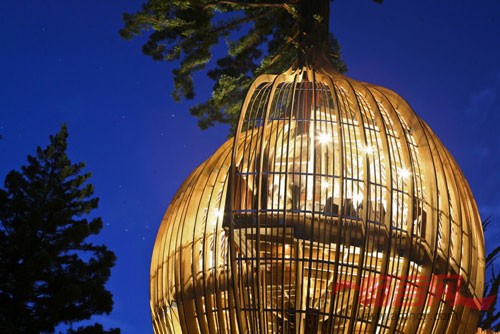 作为奢华的企业宣传活动的一部分,Yellow Pages邀请太平洋环境建筑公司(PEL)合作设计了这所树屋餐厅。该项目的形式本身就是一个大的树屋——鳞次栉比的木鳍构成了树屋简单的椭圆形空间。相对洋葱或者大蒜的形状来说,该结构更像一个巨大的蚕蛹。连建筑师自己也提到了,该建筑结构让人想起了童年时代的嬉戏和梦想,以及充满魅力和幻想的童话故事。