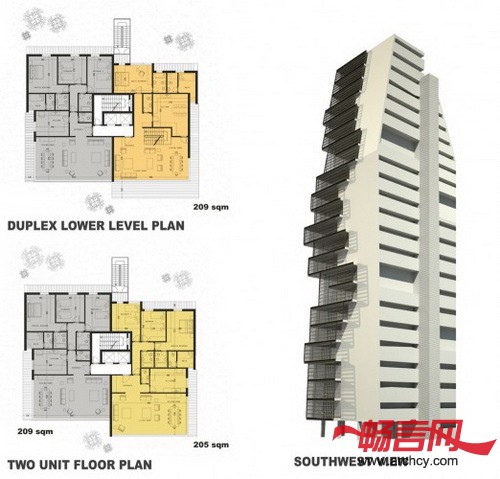 悬浮式阳台和露台的设计灵感来源于传统城市住宅的设计。在建成之后,这座住宅楼形成了一个垂直的住宅小区,而这里拥有能够观赏市中心、整个城市和大海的最佳视野。遮阳百叶窗遮挡了来自东西方向的日光,同时它也为住宅提供了更好的隐私性。