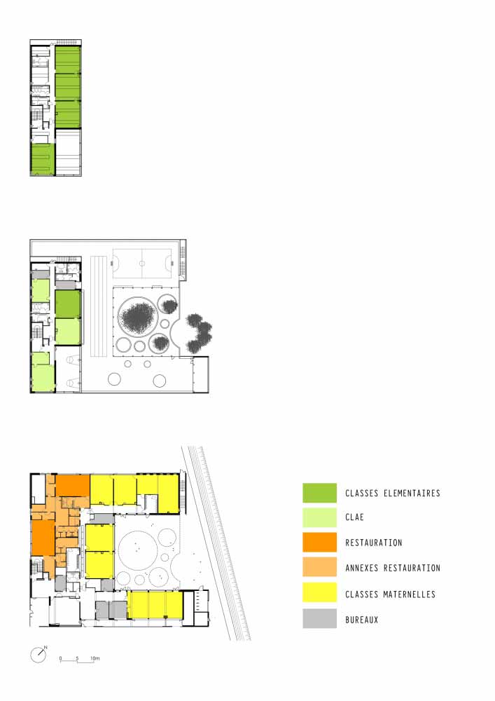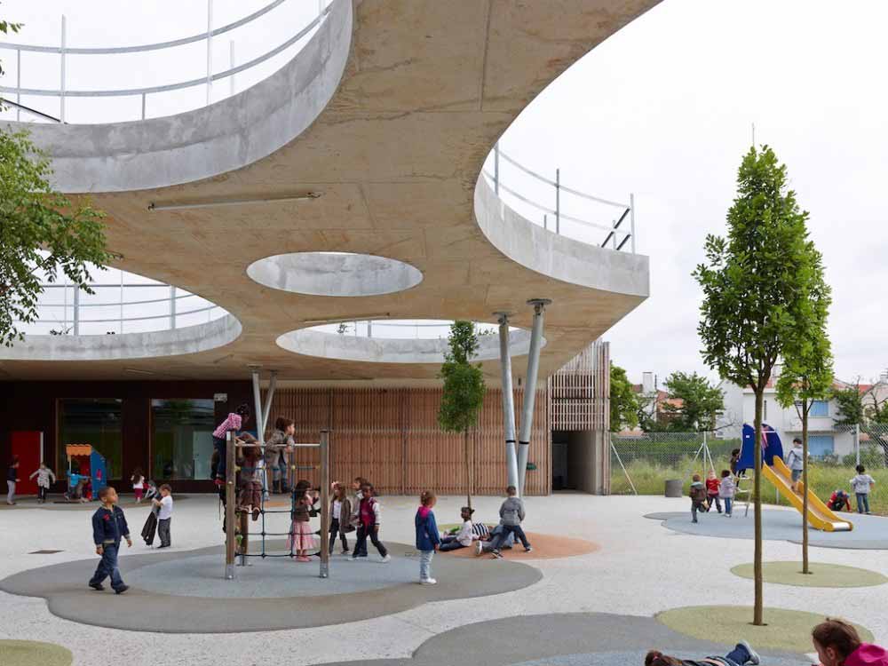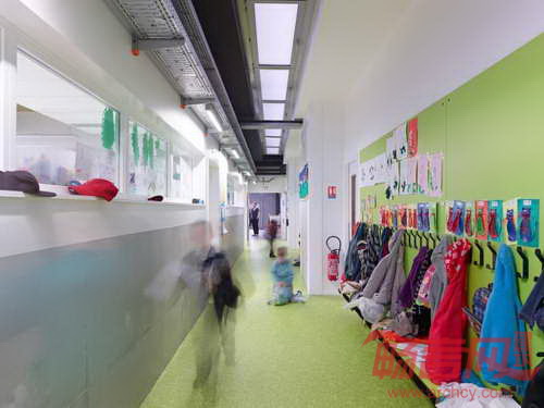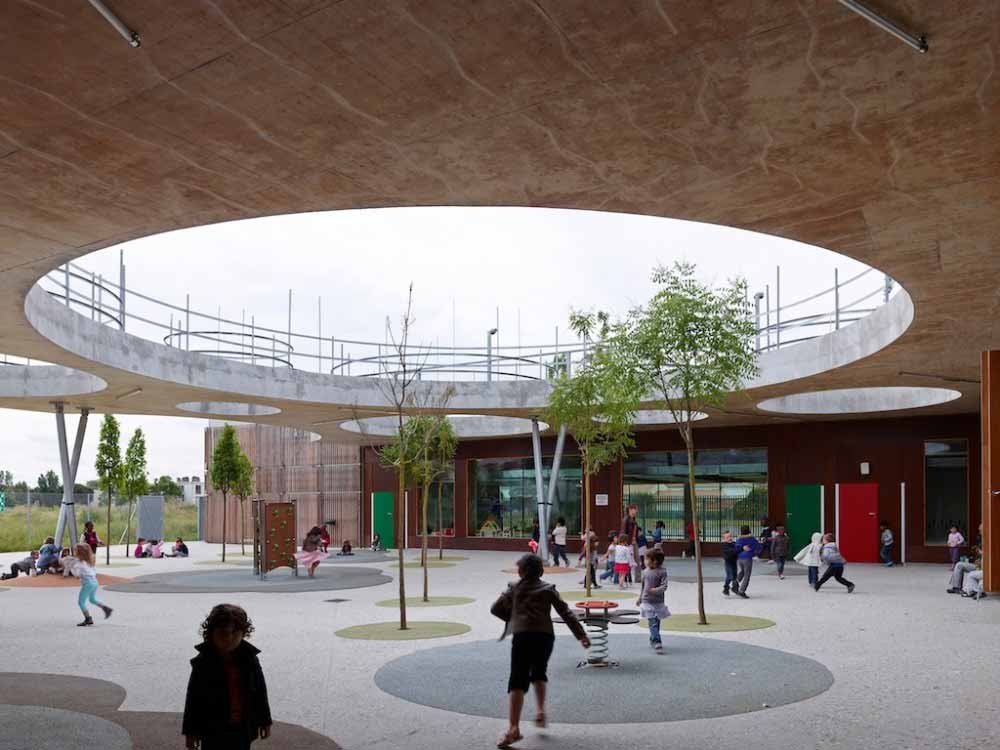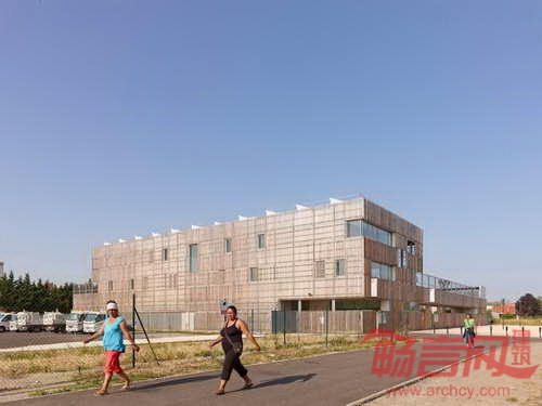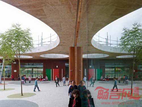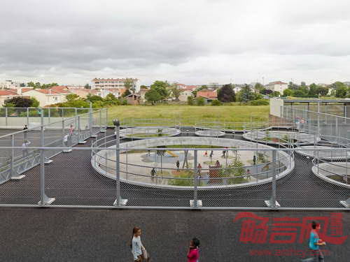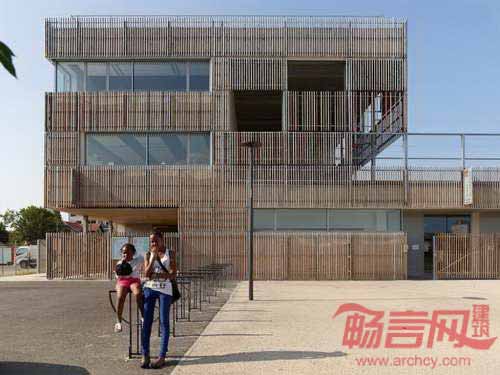 位于法国Toulouse的Lucie Aubrac学校项目是一个相当紧凑的教育综合体,其组成部分包括覆盖整个场地的幼儿园、带有孔洞的屋面、一层层高较高的狭窄体量的小学。树木穿越了屋面的空洞,连接其不同的学校操场。设计师别具匠心地参考了彩色铅笔设计,利用不连续的木质表皮覆盖了建筑外层,不仅起到了遮阳效果,同时遮挡了朝向操场的视线。