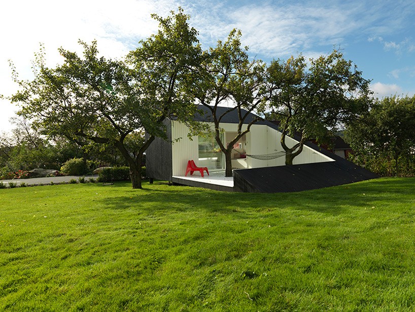 Saunders建筑事务所完成了位于挪威Haugesund的Slice住宅设计。项目仅有15平米,是在经济衰退期建造的。业主希望有一个安静的空间,享受休闲时光,欣赏宁静的花园景色。项目建造受场地条件制约,构成三角形建筑造型。露台前伸,腾出空间创造较大的房间。项目设计融入了景观之中,保护已有设施,古老的梅子树自由生长在户外露台旁边。