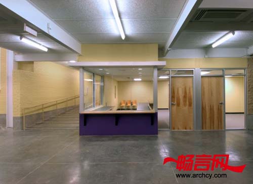 建筑师在窄道上“植入”了一个简单的钢框架,然后在其上面镶嵌上由玻璃和彩色平板组成的高窗。平板的数量和位置都参照了一天中太阳的位置,这样便使建筑能最少的吸收太阳的热量、减少太阳强光的吸入,同时又能保证室内拥有充足的阳光。在高窗的下面有一圈白色的带状装饰,它将这个新建筑与旧建筑连接起来。新的行政办公室位于一个四周由玻璃窗围绕的接待中心里面,从办公室可以清晰的看到入口和公共活动室。