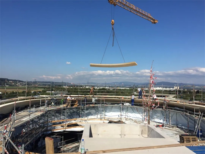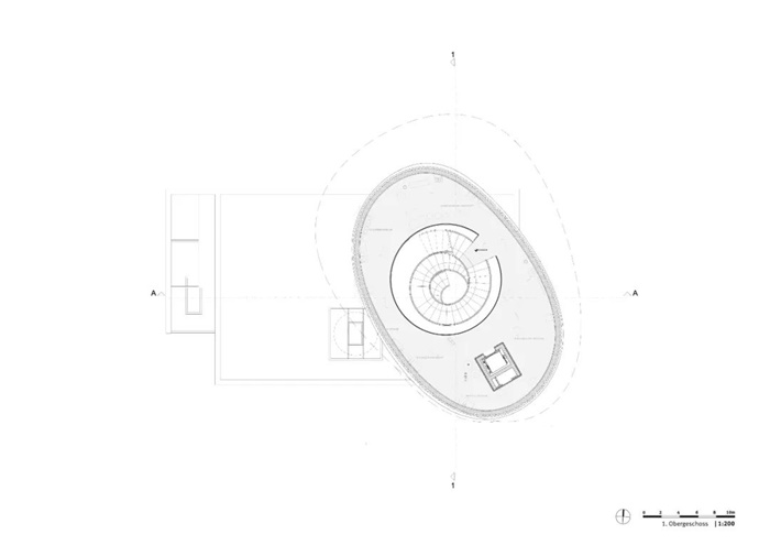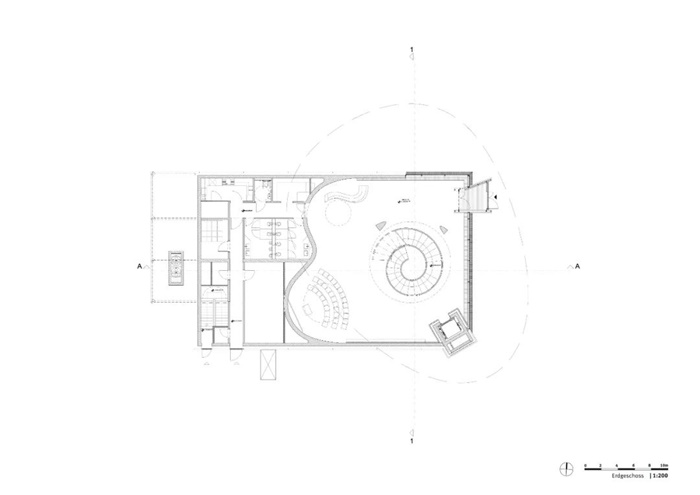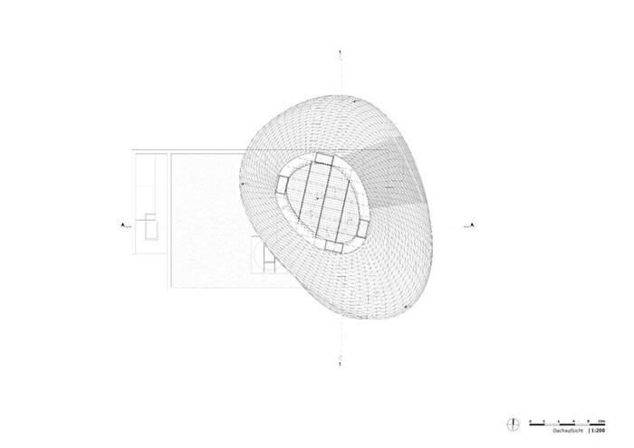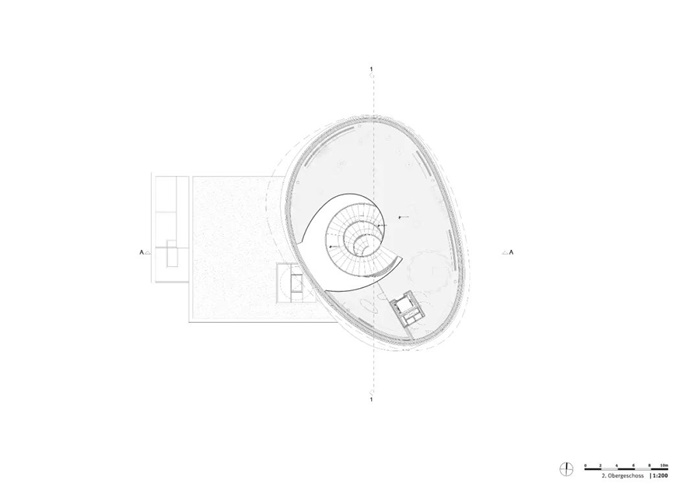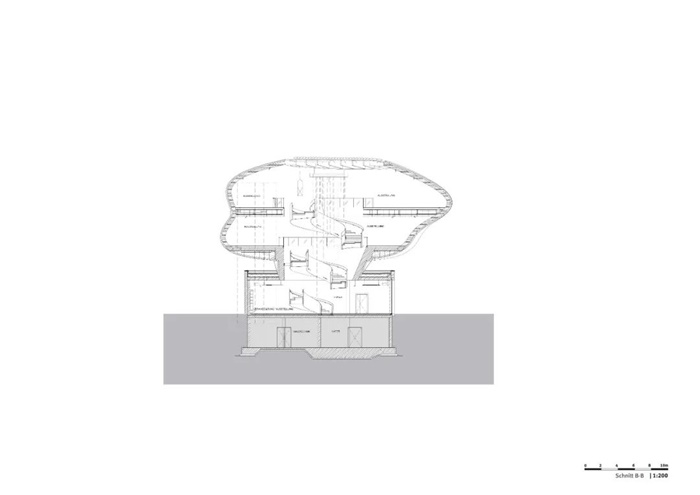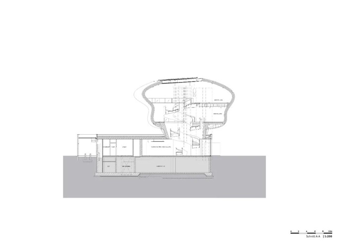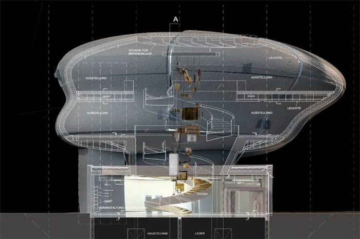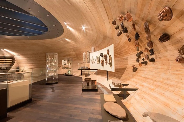 PANEUM 包含两个建筑元素:门厅与活动空间所在的方盒子基座,和其上方具有流动形态的双层展示空间,也就是面包博物馆。建筑使用的材料使这两个部分的对比变得更加强烈:盒子的部分使用了现场浇筑的混凝土立面,而面包博物馆的圆形木结构则有着不锈钢材质的饰面。基座部分包含活动空间和与其相邻的空间,可用于汇报展示、招待会以及工作坊等各种各样的活动,最多可容纳120 名参观者。
